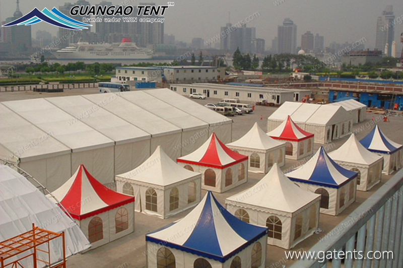 Las carpas pagoda son ampliamente utilizadas en depósitos temporales, fábricas, construcciones temporales, carpas de exhibición, carpas de construcción, socorro de emergencia, etc.
